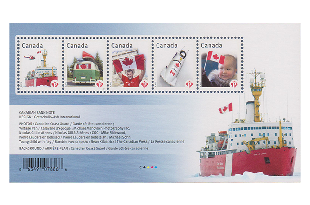 Flag On - CCGS Louis S. St-Laurent, Van Window, Olympic Athlete Carrying Flag, Bobsled and Inuit Child Waving Flag