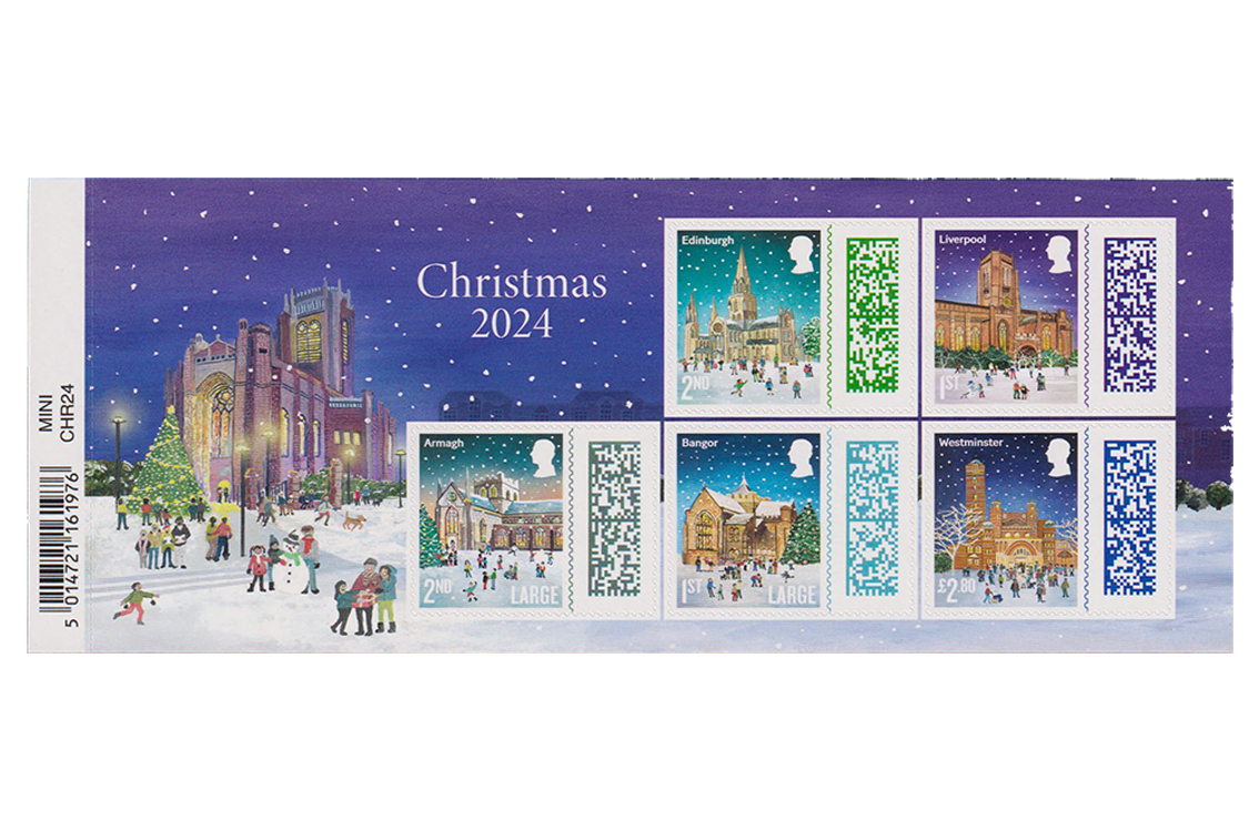 Christmas 2024 Special Stamps Set Against a Beautifully Illustrated Backdrop of a Festive Evening at a Cathedral.